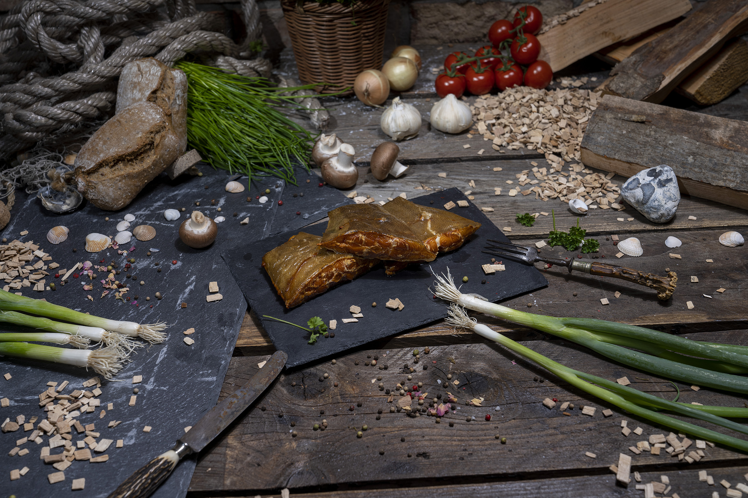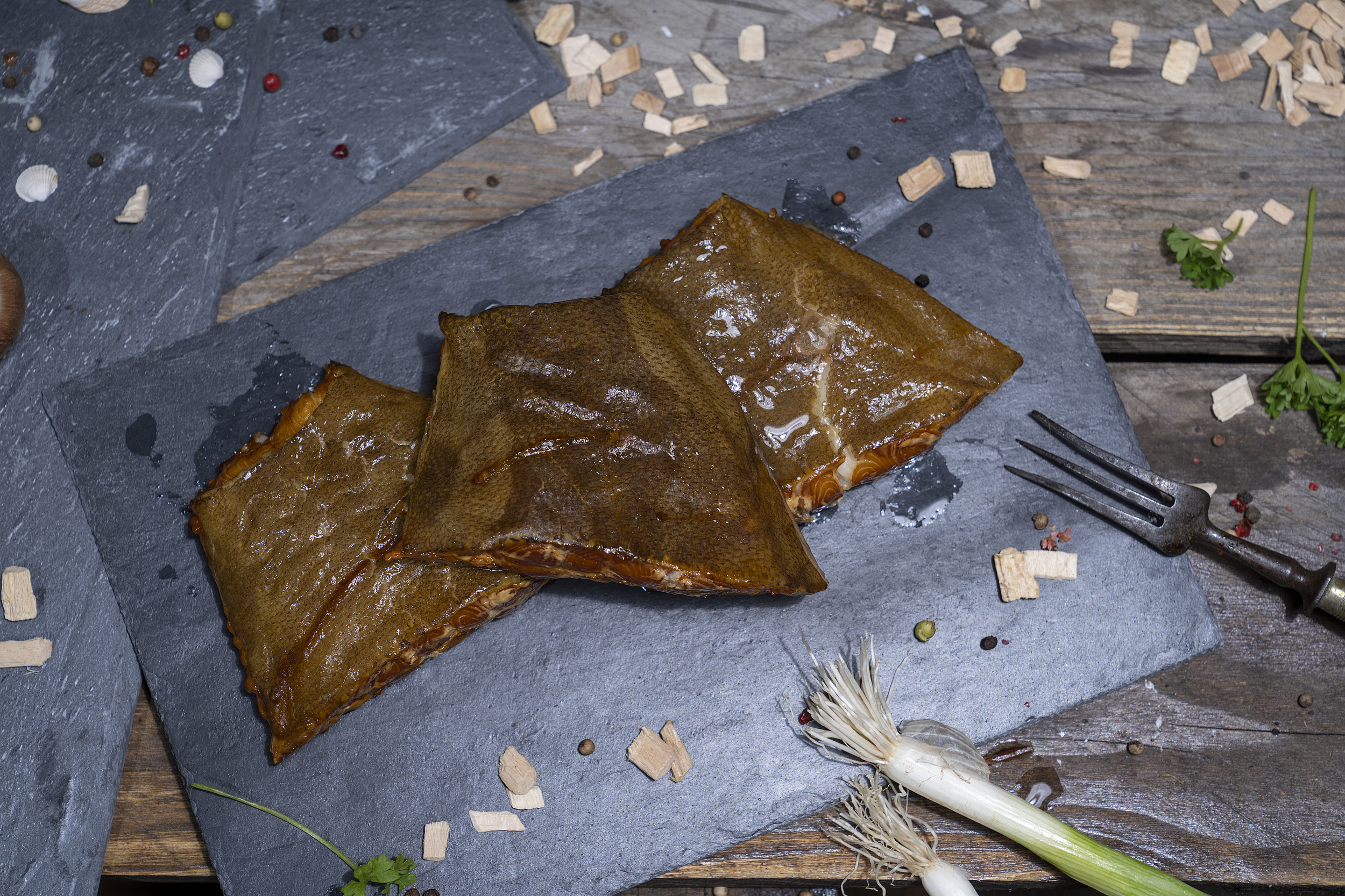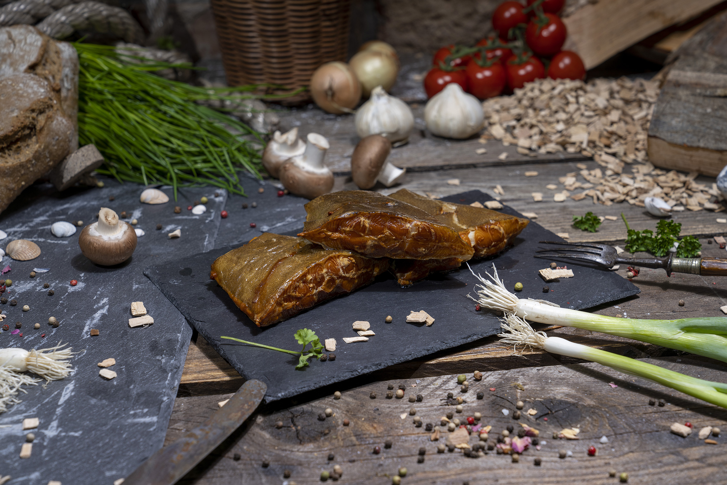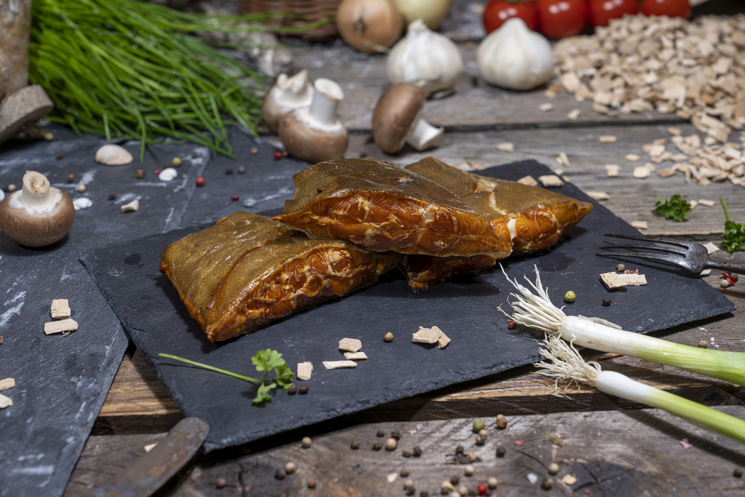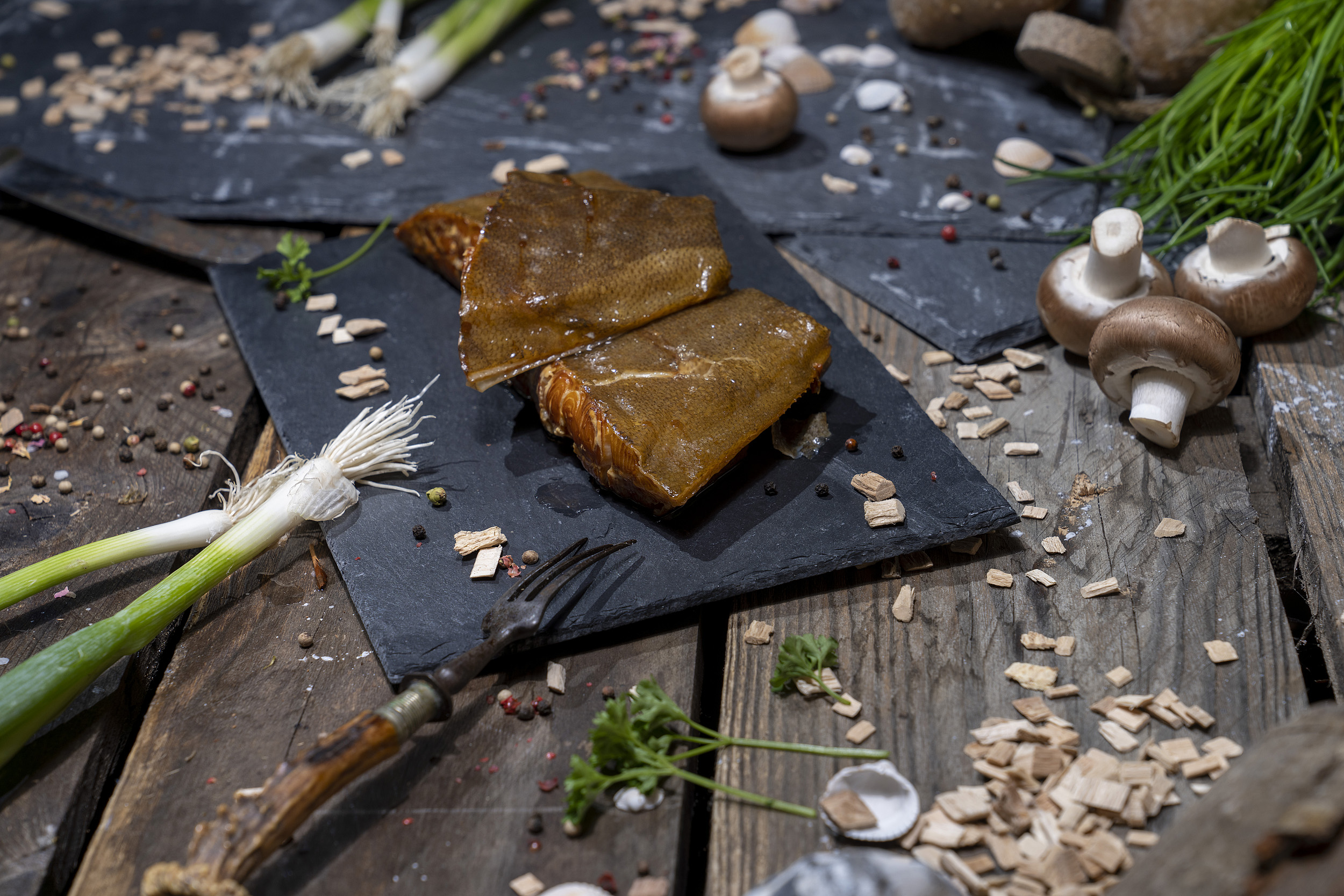 Das Endstück vom Heilbutt wird über ausgesuchten Holzspänen geräuchert. So entsteht ein Produkt mit saftiger Textur, goldener Farbe und einem unverwechselbaren Aroma, das Feinschmecker begeistert.