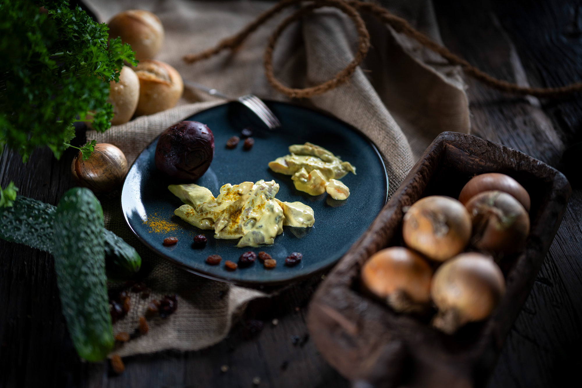 Das Geheimnis des Curry-Matjes-Salats liegt in der perfekt ausbalancierten Sauce: Eine cremige Currymischung, fein abgestimmt mit ausgewählten indischen Gewürzen, verleiht dem Gericht eine angenehme Tiefe und eine leicht pikante Wärme. Diese aromatische Basis wird durch die Zugabe eines bunten Fruchtcocktails – bestehend u. a. aus Ananas, Pfirsich und Trauben – ergänzt. Die Früchte bringen eine natürliche Süße und eine saftige Frische mit, die sich harmonisch mit dem würzigen Curry und dem salzigen Matjes verbindet.