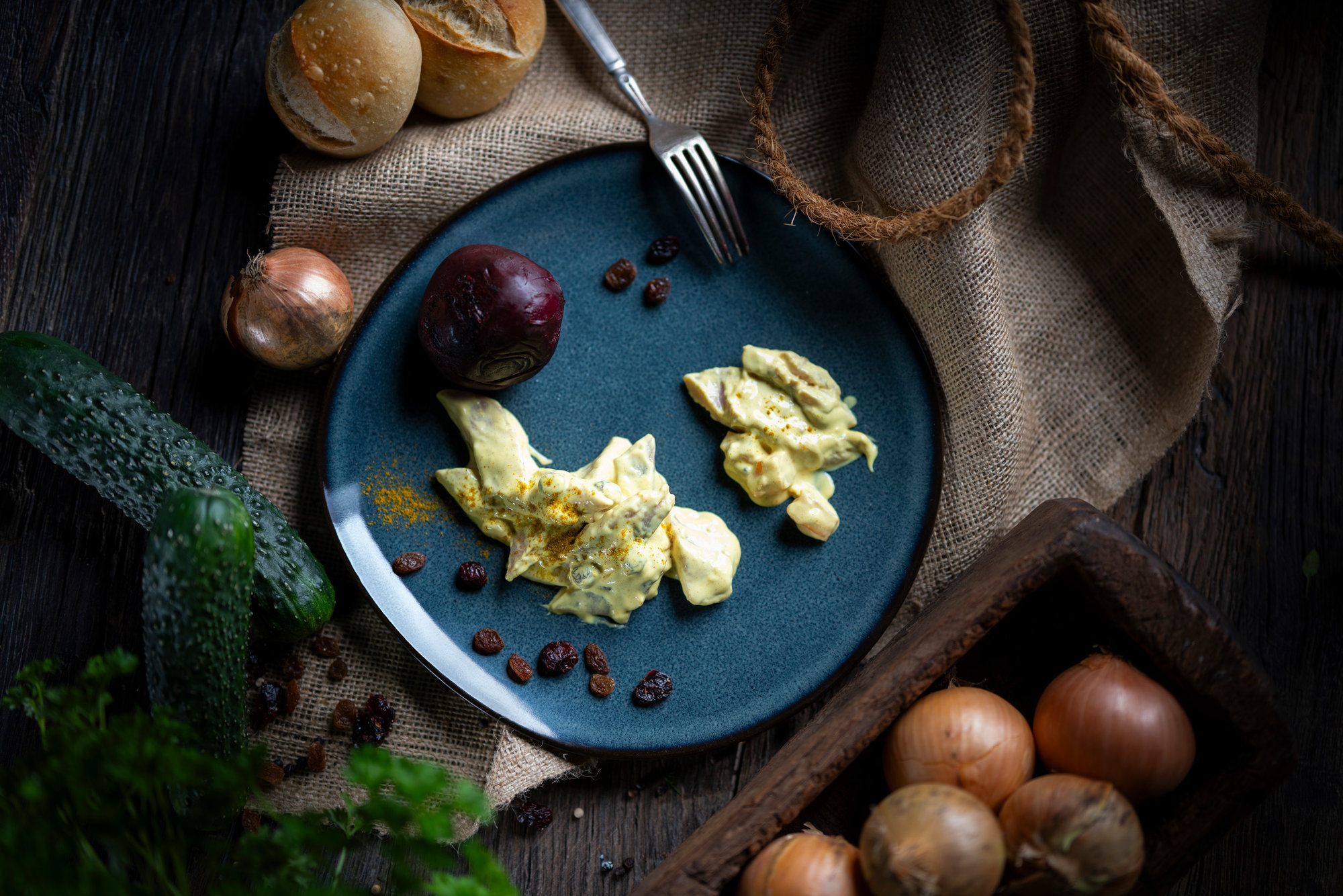 ntdecken Sie den einzigartigen Geschmack des Curry-Matjes-Salats mit Fruchtcocktail und indischem Curry!