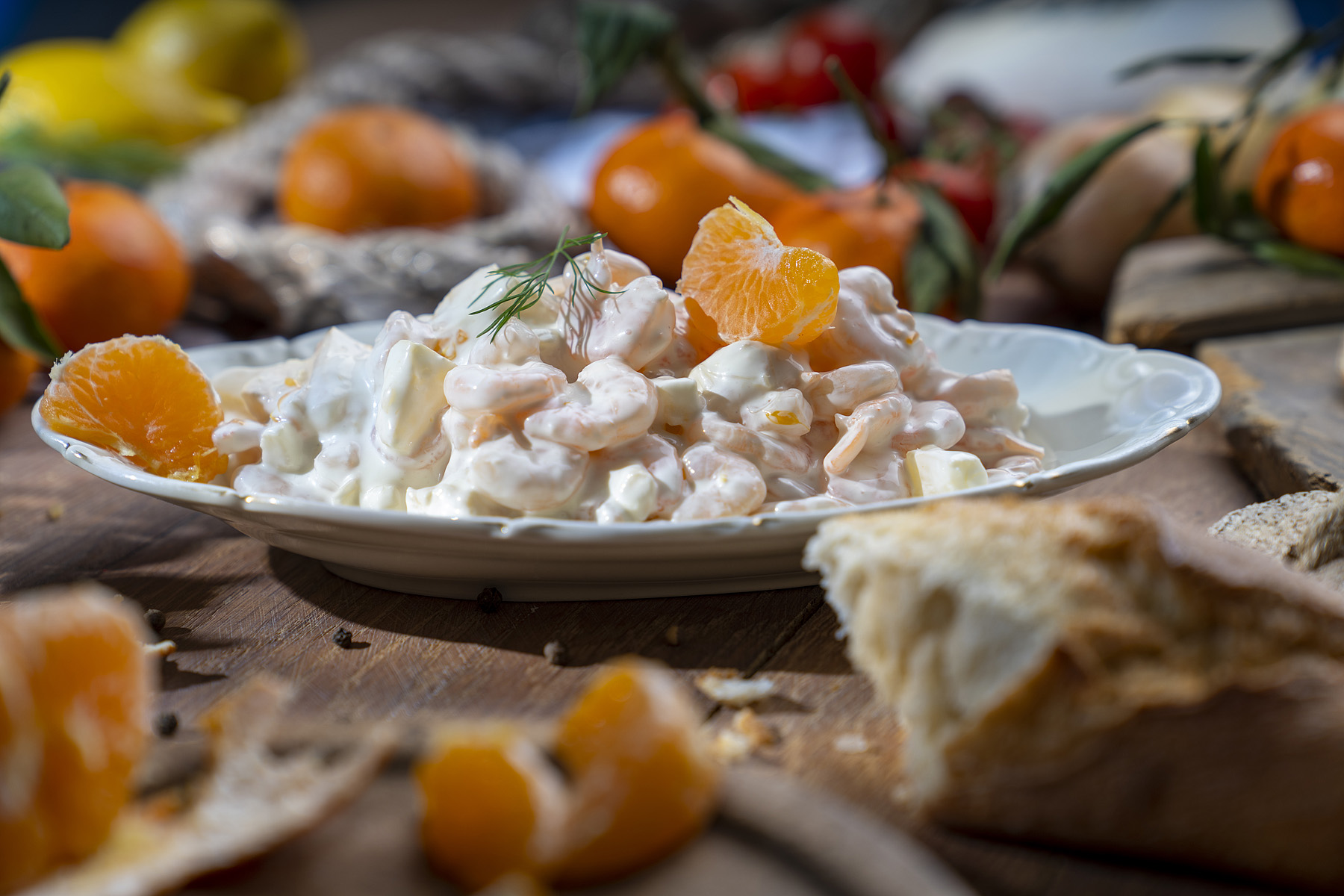 Die cremige Basis ist dezent abgeschmeckt, um die natürlichen Aromen nicht zu überdecken, sondern hervorzuheben. Sie umhüllt Garnelen und Frucht wie ein seidiger Mantel und macht jede Gabel zu einem harmonischen Geschmackserlebnis.