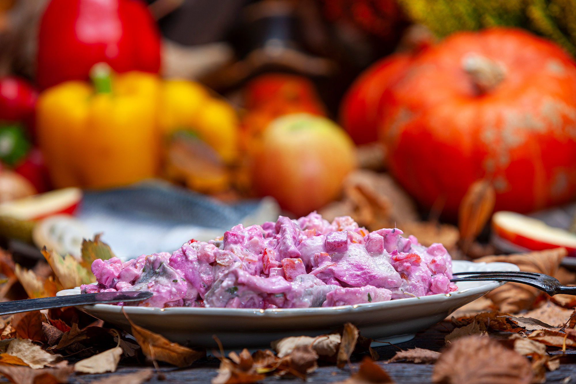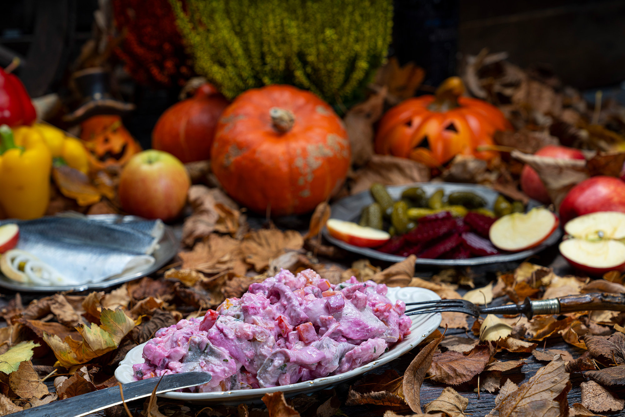 Happy Halloween! Zeit für schaurige Deko, Kürbislaternen – und einen herzhaft-süßen Heringssalat, der nicht nur optisch für Gänsehaut sorgt! Der Heringssalat „Happy-Halloween“ vereint zarten Bismarckhering, Rote Beete, Kürbis, Äpfel, Paprika und Gurke in einem herrlich cremigen Kräuterdressing – ein Highlight für jede Halloween-Tafel.